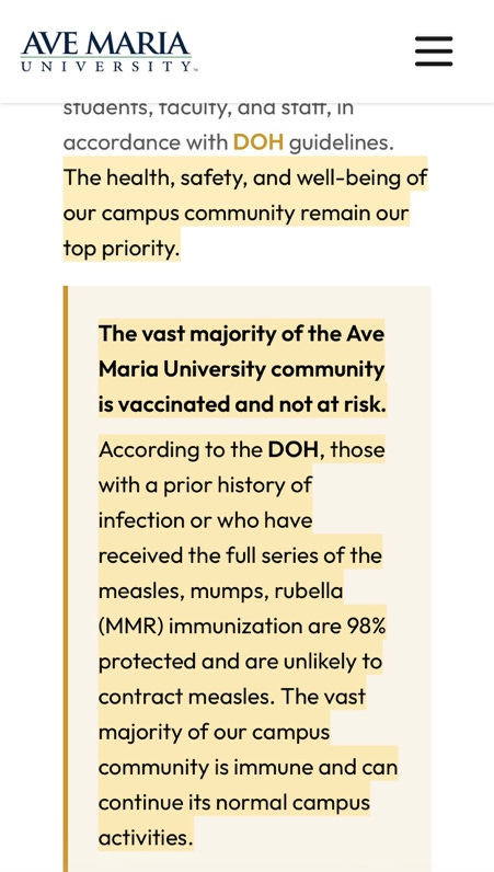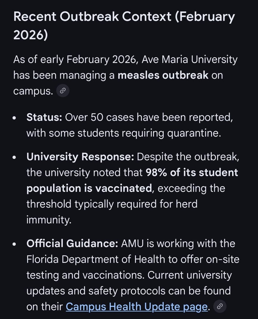 Last week I began reading about Ave Maria University in Florida where a current measles outbreak that began in early January has resulted in 46 student infections and 57 more students in quarantine.